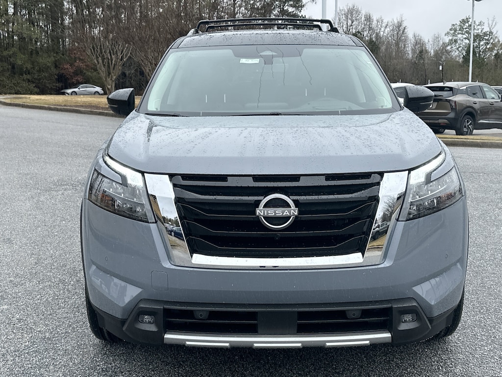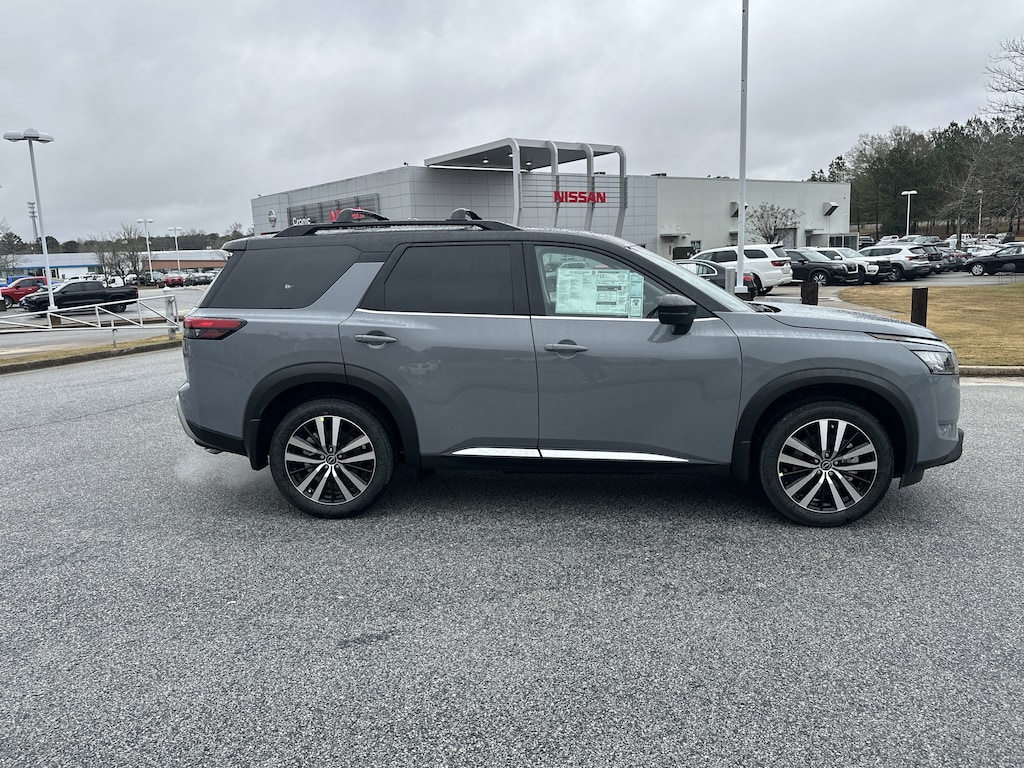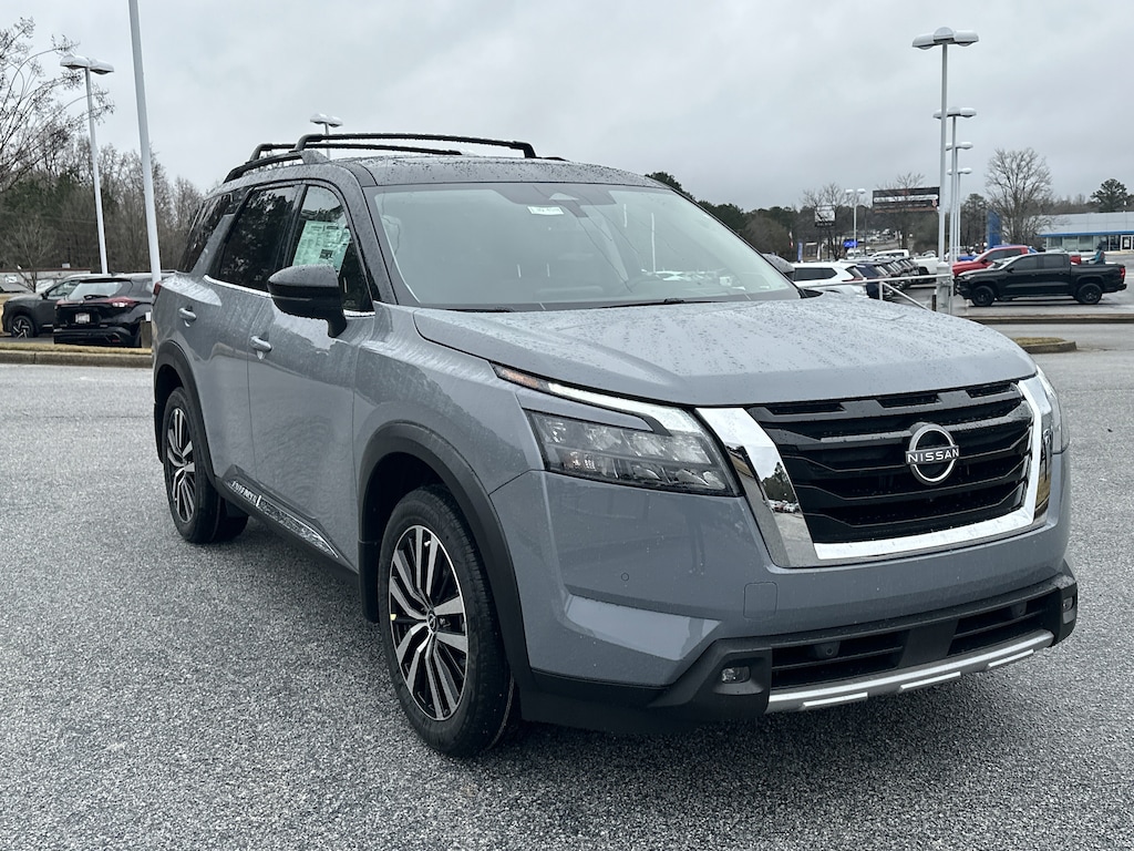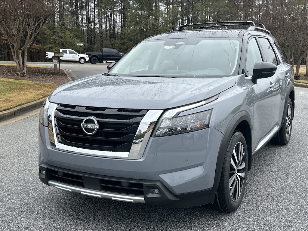 13 Speakers, 3rd row seats: bench, 4-Wheel Disc Brakes, ABS brakes, Air Conditioning, Alloy wheels, AM/FM radio: SiriusXM, Auto High-beam Headlights, Auto tilt-away steering wheel, Auto-dimming Rear-View mirror, Automatic temperature control, Bodyside moldings, Bose Premium Audio System, Brake assist, Bumpers: body-color, Climate Controlled Front Bucket Seats, Delay-off headlights, Driver door bin, Driver vanity mirror, Dual front impact airbags, Dual front side impact airbags, Electronic Stability Control, Emergency communication system, Exterior Parking Camera Rear, Four wheel independent suspension, Front anti-roll bar, Front Bucket Seats, Front Center Armrest, Front dual zone A/C, Front reading lights, Fully automatic headlights, Garage door transmitter: HomeLink, Heads-Up Display, Heated door mirrors, Heated front seats, Heated rear seats, Heated steering wheel, Illuminated entry, Knee airbag, Leather steering wheel, Low tire pressure warning, Memory seat, Navigation system: NissanConnect with Navigation and Services, NissanConnect featuring Apple CarPlay and Android Auto, Occupant sensing airbag, Outside temperature display, Overhead airbag, Overhead console, Panic alarm, Passenger door bin, Passenger vanity mirror, Power door mirrors, Power driver seat, Power Liftgate, Power moonroof, Power passenger seat, Power steering, Power windows, Radio data system, Radio: AM/FM Audio System, Rain sensing wipers, Rear air conditioning, Rear anti-roll bar, Rear reading lights, Rear seat center armrest, Rear side impact airbag, Rear window defroster, Rear window wiper, Reclining 3rd row seat, Remote keyless entry, Security system, Semi-Aniline Leather-Appointed Seating Surfaces, Speed control, Speed-sensing steering, Speed-Sensitive Wipers, Split folding rear seat, Spoiler, Steering wheel memory, Steering wheel mounted audio controls, Tachometer, Telescoping steering wheel, Tilt steering wheel, Traction control, Trip computer, Turn signal indicator mirrors, Variably intermittent wipers, Ventilated front seats, Wheels: 20" x 8J Machined Alloy. New vehicle price includes all manufacturer and dealer incentives. Must finance with NMAC at standard rates to receive displayed price. Cash price may vary depending on NMAC and Dealer incentives. Not everyone qualifies for NMAC financing. Price in lieu of any special APR incentives cannot be combined with other offers unless specifically disclosed by the dealer. Prices do not include tax, tag, title or Georgia Lemon Law fees. Displayed prices include dealer doc fee and electronic filing fee. All pre-owned vehicles may also be subject to additional reconditioning and certification fees. Gray 2025 Nissan Pathfinder Platinum FWD 3.5L V6 DOHC 9-Speed Automatic
