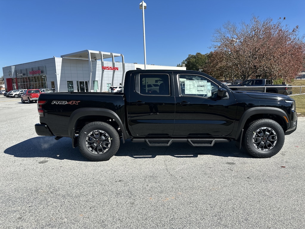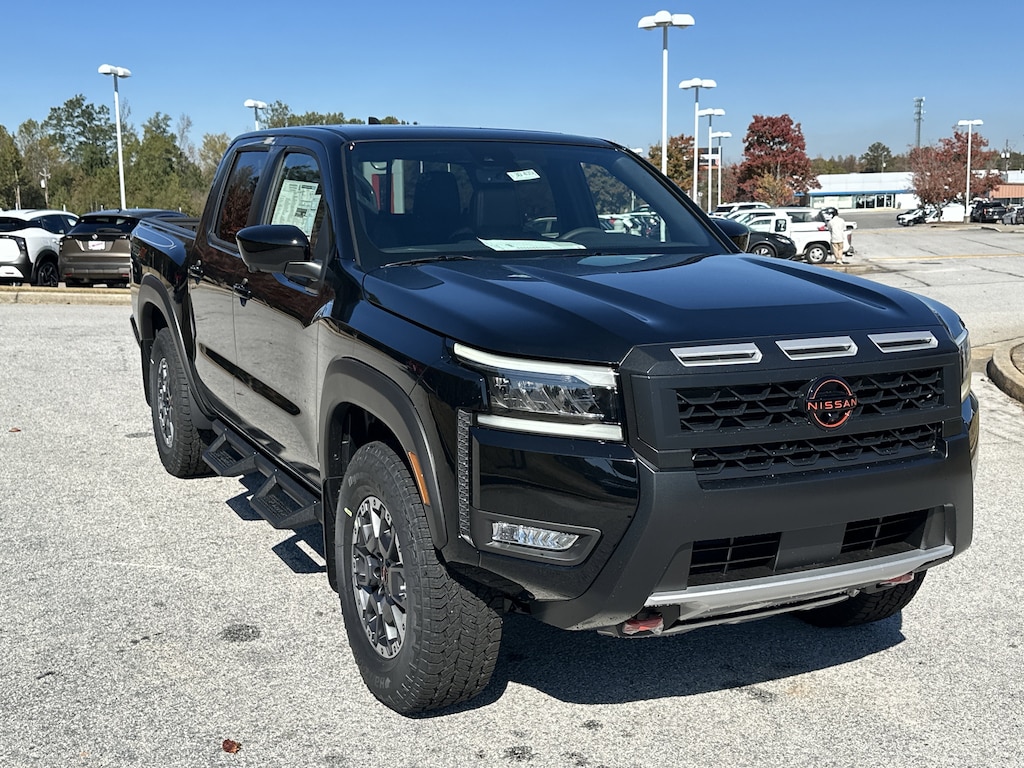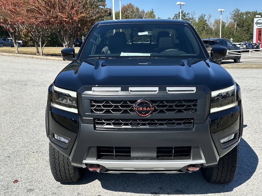 4WD, 17" Painted Alloy Wheels, 2-Tone Beadlock Style Wheel, 3.692 Axle Ratio, 4-Wheel Disc Brakes, 6 Speakers, ABS brakes, Air Conditioning, Alloy wheels, AM/FM radio: SiriusXM, Anti-whiplash front head restraints, Auto High-beam Headlights, Automatic temperature control, Blind Spot Warning, Brake assist, Bumpers: body-color, Delay-off headlights, Driver door bin, Driver vanity mirror, Dual front impact airbags, Dual front side impact airbags, Electronic Stability Control, Electronic Tailgate Lock, Emergency communication system, Essentials Kit, Front anti-roll bar, Front Bucket Seats, Front Center Armrest, Front dual zone A/C, Front fog lights, Front reading lights, Front wheel independent suspension, Fully automatic headlights, Heated Front Bucket Seats, Heated front seats, Heated steering wheel, Illuminated entry, Knee airbag, Leather Seat Trim, Leather steering wheel, Low tire pressure warning, Mud Flaps, Occupant sensing airbag, Off-Road Style Step Rails, Overhead airbag, Overhead console, Panic alarm, Passenger door bin, Passenger vanity mirror, Power door mirrors, Power driver seat, Power passenger seat, Power steering, Power windows, PRO Embroidered Premium Cloth Seat Trim, PRO Premium Package, PRO-4X Carpeted Floor Mats, PRO-4X Convenience Package, Radio data system, Radio: SXM/AM/FM/AUX/USB Audio System, Rear anti-roll bar, Rear seat center armrest, Rear side impact airbag, Rear step bumper, Remote keyless entry, Security system, Speed control, Speed-sensing steering, Split folding rear seat, Steering wheel mounted audio controls, Tachometer, Telescoping steering wheel, Tilt steering wheel, Tow Package (T11), Traction control, Trip computer, Variably intermittent wipers, Voltmeter, Wireless Apple CarPlay/Wireless Android Auto, 4WD. New vehicle price includes all manufacturer and dealer incentives. Must finance with NMAC at standard rates to receive displayed price. Cash price may vary depending on NMAC and Dealer incentives. Not everyone qualifies for NMAC financing. Price in lieu of any special APR incentives cannot be combined with other offers unless specifically disclosed by the dealer. Prices do not include tax, tag, title or Georgia Lemon Law fees. Displayed prices include dealer doc fee and electronic filing fee. All pre-owned vehicles may also be subject to additional reconditioning and certification fees. Super Black 2026 Nissan Frontier PRO-4X 4WD 3.8L DI DOHC 24V V6 9-Speed Automatic with Overdrive