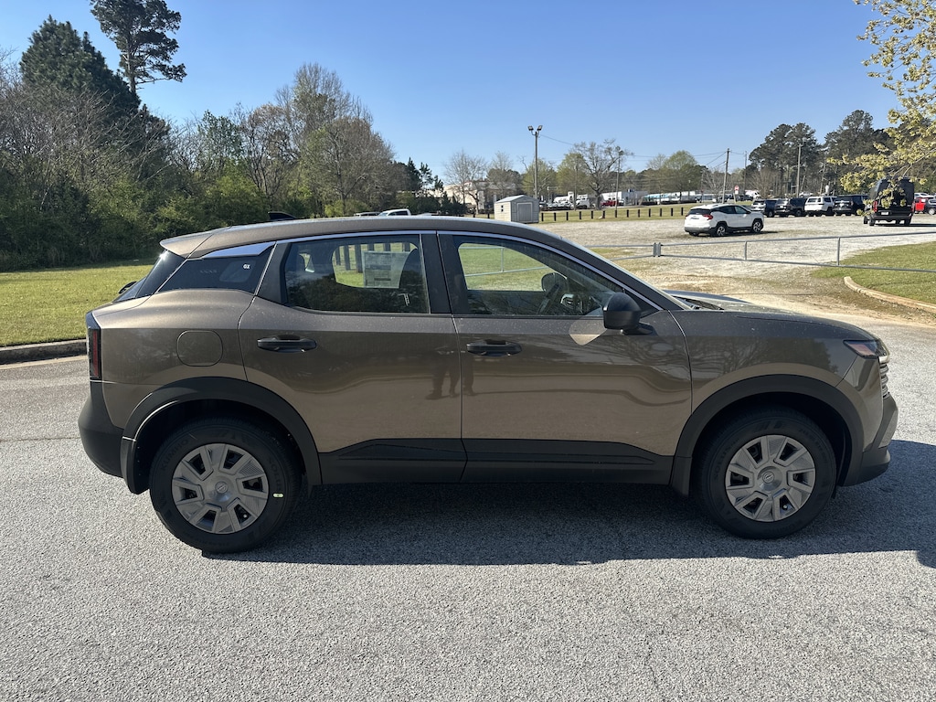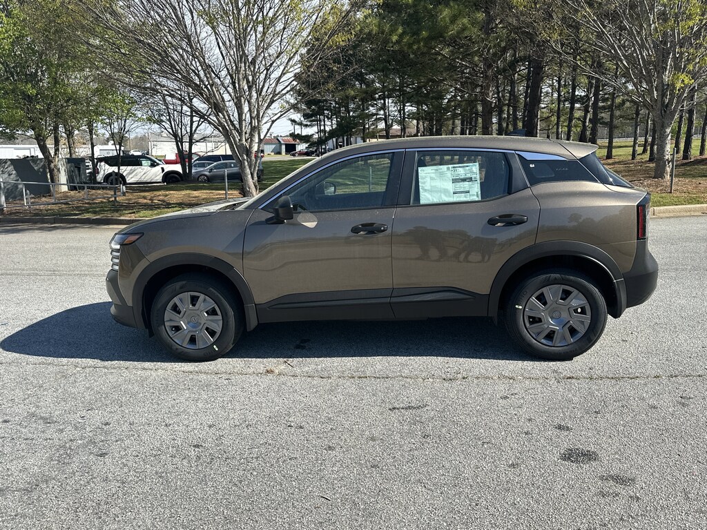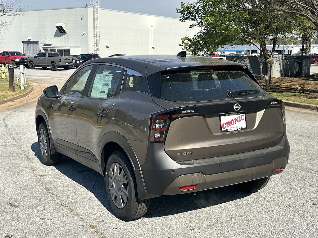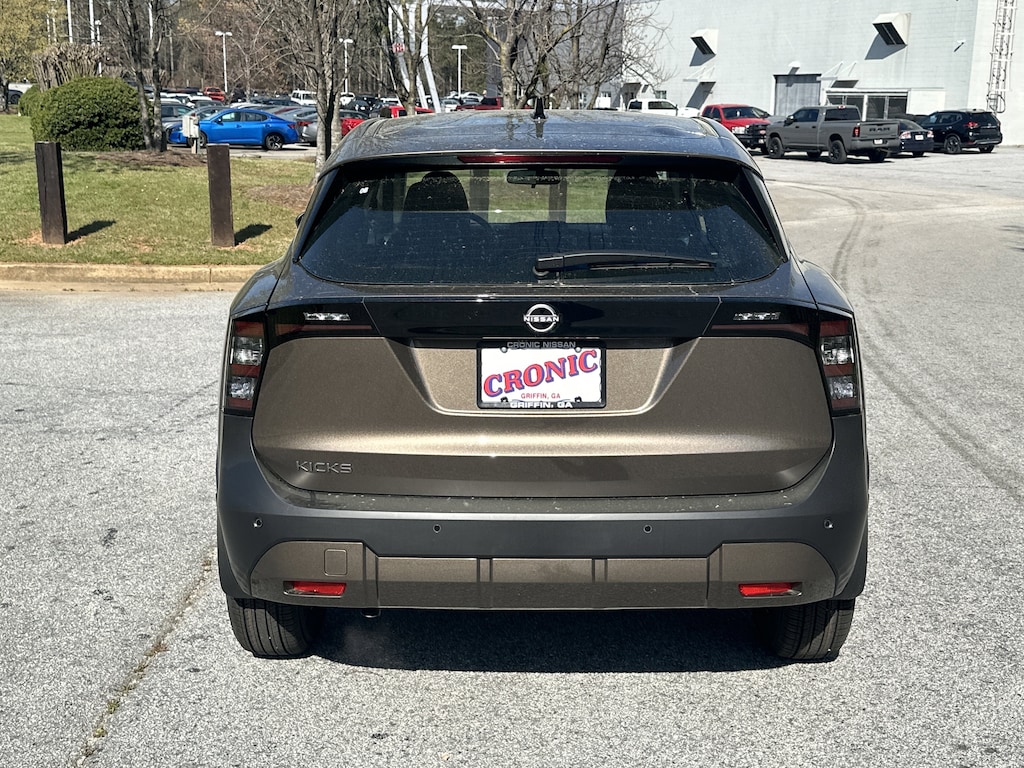 4 Speakers, 4-Wheel Disc Brakes, ABS brakes, Air Conditioning, AM/FM radio, Auto High-beam Headlights, Blind Spot Warning, Brake assist, Bumpers: body-color, Cloth Seat Trim, Driver door bin, Driver vanity mirror, Driver's Seat Mounted Armrest, Dual front impact airbags, Dual front side impact airbags, Electronic Stability Control, Emergency communication system, Exterior Parking Camera Rear, Front anti-roll bar, Front Bucket Seats, Front reading lights, Front wheel independent suspension, Fully automatic headlights, Illuminated entry, Knee airbag, Low tire pressure warning, NissanConnect featuring Apple CarPlay and Android Auto, Occupant sensing airbag, Outside temperature display, Overhead airbag, Panic alarm, Passenger door bin, Passenger vanity mirror, Power door mirrors, Power steering, Power windows, Radio data system, Radio: AM/FM/SiriusXM Audio System, Rear anti-roll bar, Rear reading lights, Rear side impact airbag, Rear window defroster, Rear window wiper, Remote keyless entry, Security system, Speed control, Speed-sensing steering, Split folding rear seat, Spoiler, Sport steering wheel, Steering wheel mounted audio controls, Tachometer, Telescoping steering wheel, Tilt steering wheel, Traction control, Trip computer, Variably intermittent wipers. New vehicle price includes all manufacturer and dealer incentives. Must finance with NMAC at standard rates to receive displayed price. Cash price may vary depending on NMAC and Dealer incentives. Not everyone qualifies for NMAC financing. Price in lieu of any special APR incentives cannot be combined with other offers unless specifically disclosed by the dealer. Prices do not include tax, tag, title or Georgia Lemon Law fees. Displayed prices include dealer doc fee and electronic filing fee. All pre-owned vehicles may also be subject to additional reconditioning and certification fees. Bronze Metallic 2026 Nissan Kicks S FWD 2.0L DOHC CVT with Xtronic