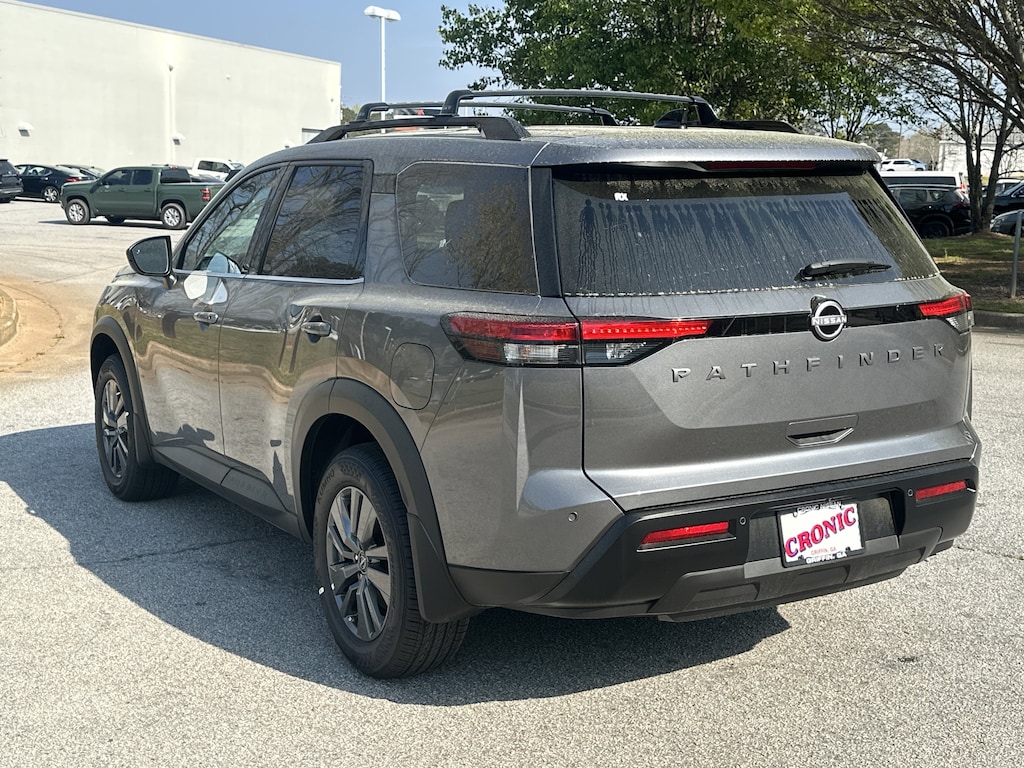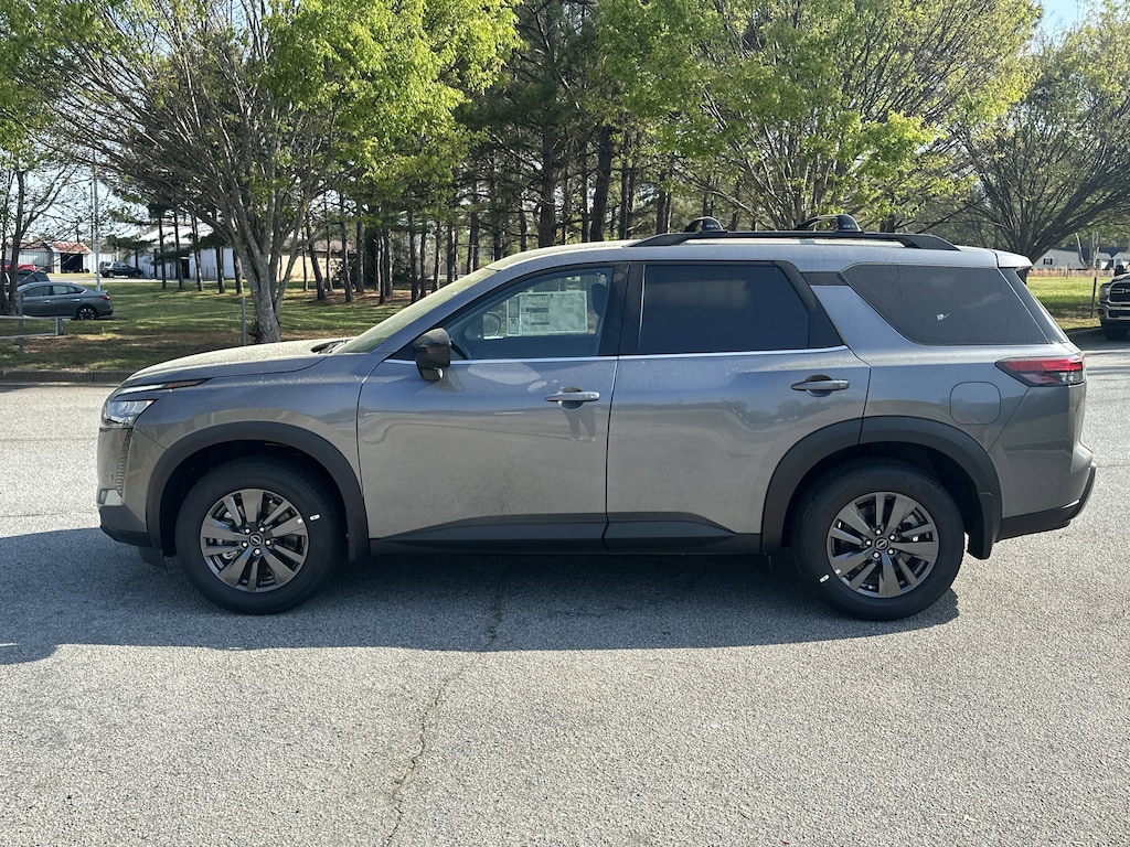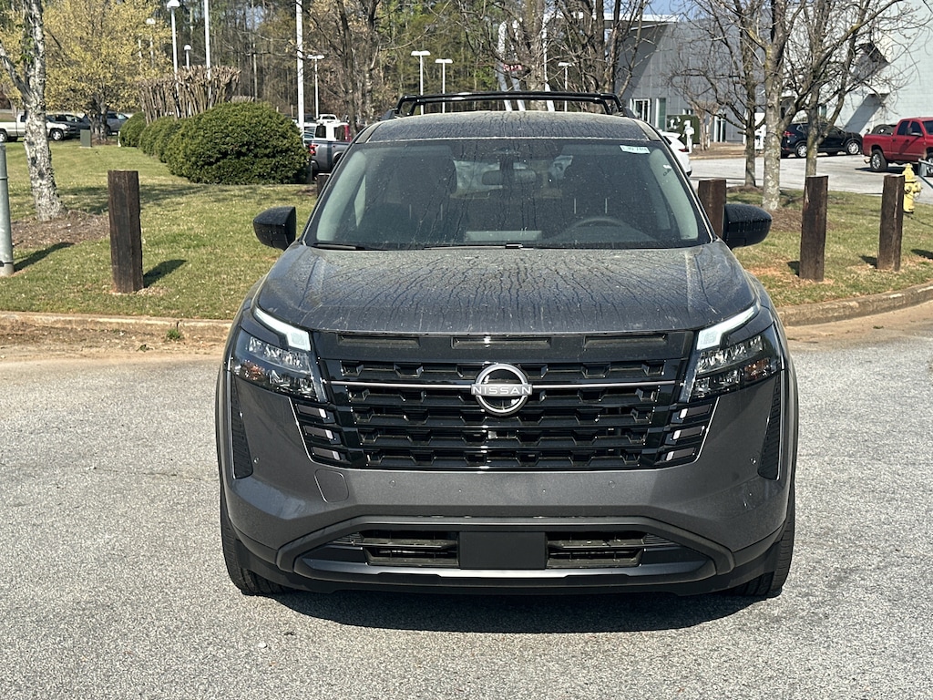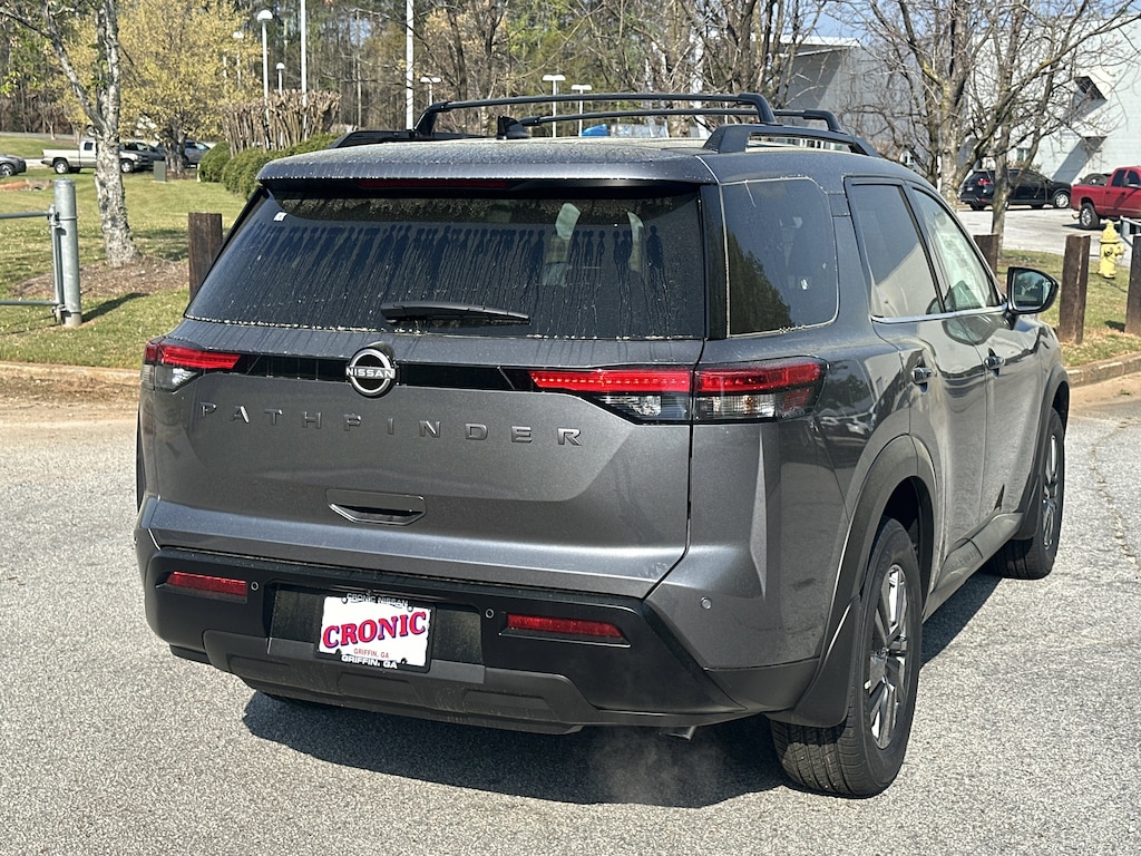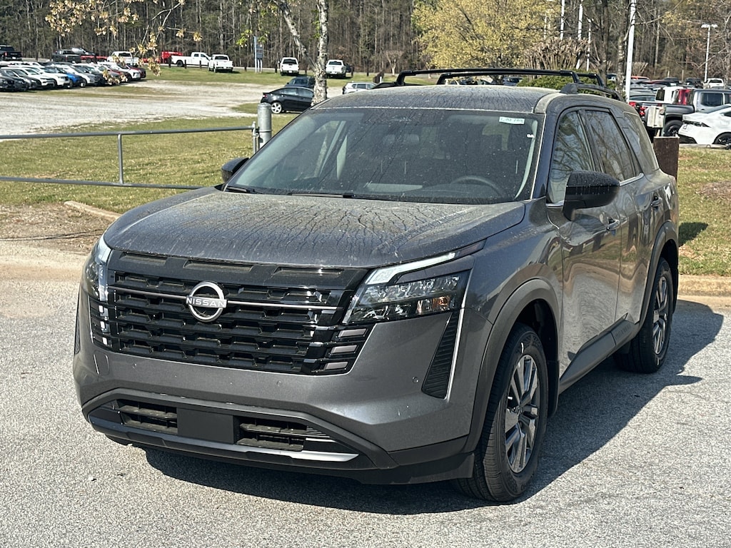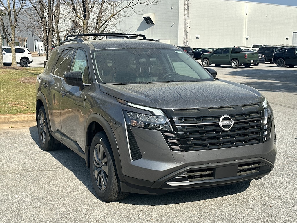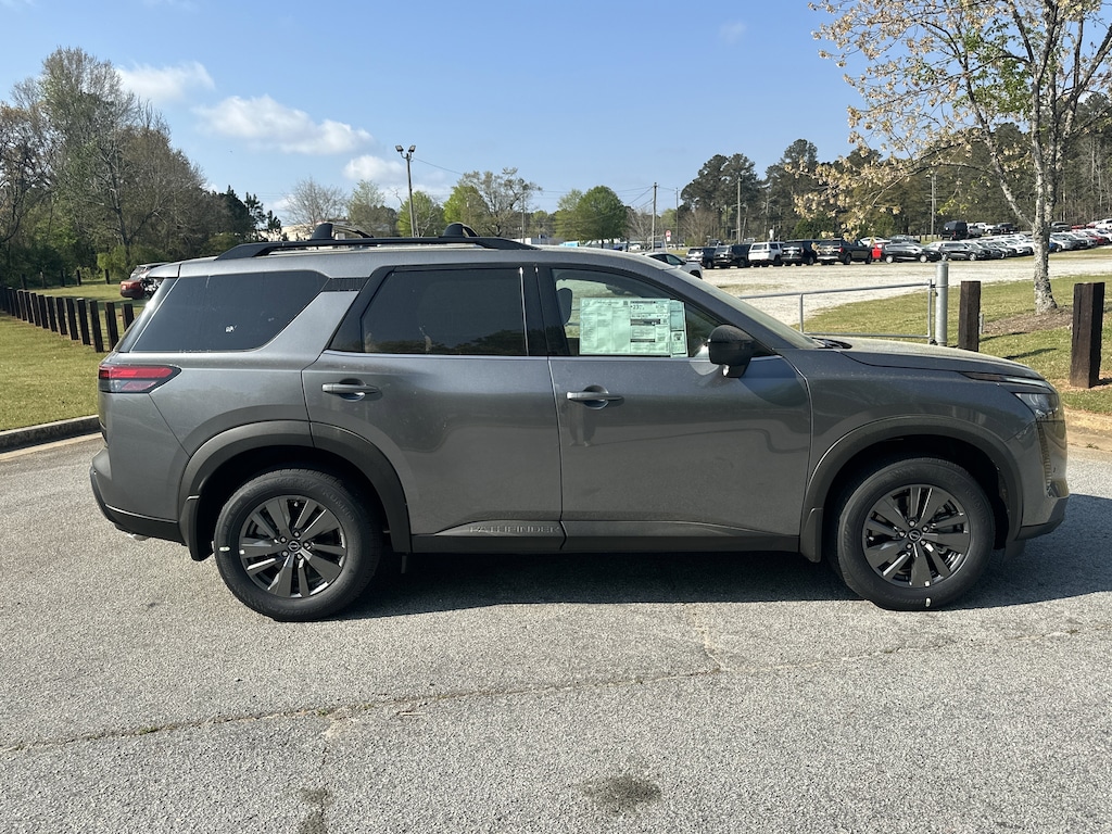 18" Painted Alloy Wheels, 3rd row seats: bench, 4-Piece Black Splash Guards, 4-Wheel Disc Brakes, 6 Speakers, ABS brakes, Air Conditioning, Alloy wheels, AM/FM radio: SiriusXM w/360L, Auto High-beam Headlights, Automatic temperature control, Bench Seat Carpeted Floor Mats, Brake assist, Bumpers: body-color, Cloth Seating Surfaces, Cross Bars, Delay-off headlights, Driver door bin, Driver vanity mirror, Dual front impact airbags, Dual front side impact airbags, Electronic Stability Control, Emergency communication system: NissanConnect Services, Four wheel independent suspension, Front anti-roll bar, Front Bucket Seats, Front Center Armrest, Front dual zone A/C, Front reading lights, Fully automatic headlights, Garage door transmitter: myQ Connected Garage, Heated door mirrors, Heated Front Bucket Seats, Heated front seats, Illuminated entry, Knee airbag, Low tire pressure warning, NissanConnect featuring Apple CarPlay and Android Auto, Occupant sensing airbag, Outside temperature display, Overhead airbag, Overhead console, Panic alarm, Passenger door bin, Passenger vanity mirror, Power door mirrors, Power driver seat, Power Liftgate, Power steering, Power windows, Radio data system, Radio: AM/FM Audio System with NissanConnect, Rear air conditioning, Rear anti-roll bar, Rear reading lights, Rear seat center armrest, Rear side impact airbag, Rear window defroster, Rear window wiper, Reclining 3rd row seat, Remote keyless entry, Security system, Speed control, Speed-sensing steering, Split folding rear seat, Spoiler, Steering wheel mounted audio controls, Tachometer, Telescoping steering wheel, Tilt steering wheel, Traction control, Trip computer, Variably intermittent wipers. New vehicle price includes all manufacturer and dealer incentives. Must finance with NMAC at standard rates to receive displayed price. Cash price may vary depending on NMAC and Dealer incentives. Not everyone qualifies for NMAC financing. Price in lieu of any special APR incentives cannot be combined with other offers unless specifically disclosed by the dealer. Prices do not include tax, tag, title or Georgia Lemon Law fees. Displayed prices include dealer doc fee and electronic filing fee. All pre-owned vehicles may also be subject to additional reconditioning and certification fees. Gun Metallic 2026 Nissan Pathfinder SV FWD 3.5L V6 DOHC 9-Speed Automatic